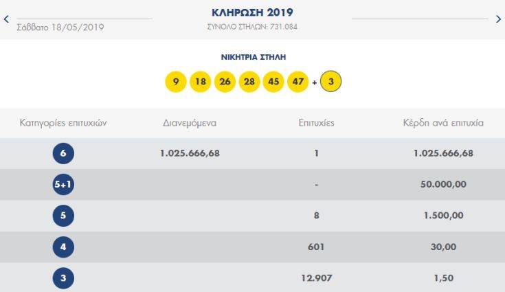 Οι τυχεροί αριθμοί του ΛΟΤΤΟ είναι: 9, 18, 26, 28, 45, 47 Bonus: 3