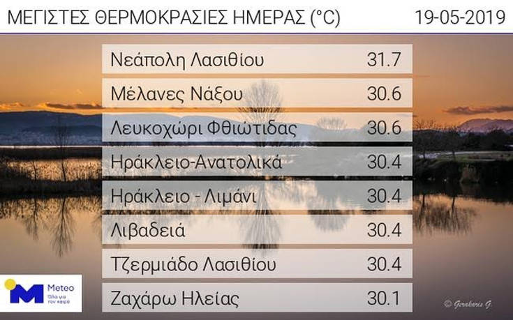 Οι σταθμοί του δικτύου αυτόματων μετεωρολογικών σταθμών του Εθνικού Αστεροσκοπείου Αθηνών/meteo.gr, που κατέγραψαν τις υψηλότερες μέγιστες θερμοκρασίες χθες, ήσαν στη Νεάπολη Λασιθίου (31,7), στις Μέλανες Νάξου (30,6), στο Λευκοχώρι Φθιώτιδας (30,6), στο Ηράκλειο Κρήτης (30,4) και στη Λιβαδειά (30,4).