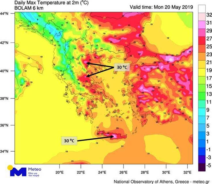 Η μέγιστη θερμοκρασία το μεσημέρι της Δευτέρας 20/05, προβλέπεται να φτάσει τοπικά τους 30 βαθμούς Κελσίου, στην Κρήτη και τα ανατολικά ηπειρωτικά τμήματα, όπως διακρίνεται στο Χάρτη.