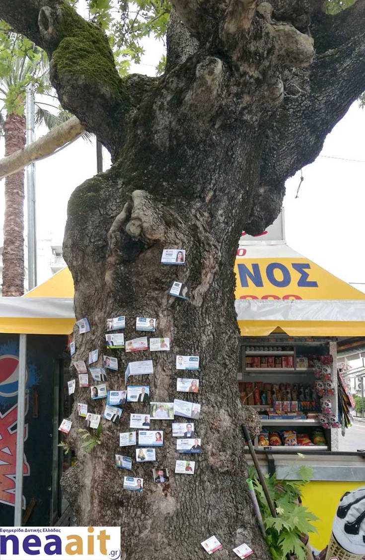 «Ο πλάτανος των υποψηφίων» όπως αναφέρουν τα «Νέα της Αιρωλοακαρνανίας» συγκέντρωσε δεκάδες κάρτες στον κορμό του. «Οι περισσότεροι υποψήφιοι που περνούν από εδώ, βάζουν και μια κάρτα», αναφέρει στην τοπική εφημερίδα ένας οδηγός ταξί.