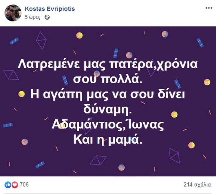 «Λατρεμένε μας πατέρα, χρόνια σου πολλά. Η αγάπη μας να σου δίνει δύναμη. Αδαμάντιος, Ίωνας. Και η μαμά» έγραψαν.