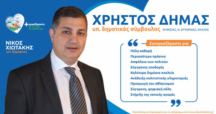 Με τον συνδυασμό «+εργαζόμαστε για την Πόλη της Καρδιάς μας» κατεβαίνει στις δημοτικές εκλογές ο υποψήφιος δημοτικός σύμβουλος στον διευρυμένο δήμο Κηφισιάς, Νέας Ερυθραίας και Εκάλης, Χρήστος Δήμας.