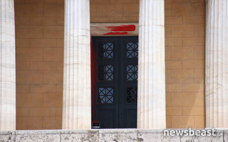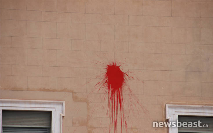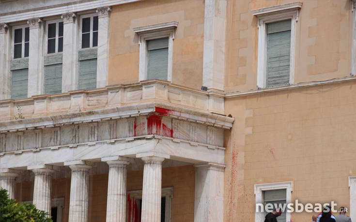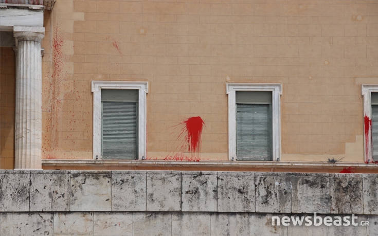 Μία ομάδα περίπου 15 ατόμων βγήκε από την οδό Όθωνος και πέταξε μπογιές και δύο καπνογόνα στο μπροστινό μέρος της Βουλής πριν εξαφανιστεί προς την πλευρά της πλατείας Συντάγματος.
