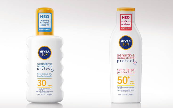 Η νέα σειρά αντηλιακής προστασίας NIVEA Sun Sensitive Immediate Protect είναι ειδικά σχεδιασμένη για επιδερμίδες πολύ ευαίσθητες και μη ανεκτικές στην ηλιακή ακτινοβολία. Η νέα σειρά αντηλιακών με SPF 30 και 50+ που φέρει την υπογραφή της NIVEA, φροντίζει την επιδερμίδα, ενώ ταυτόχρονα την προστατεύει από ερεθισμούς που προκαλούνται από τον ήλιο και από τις μακροπρόθεσμες και βραχυπρόθεσμες αρνητικές επιπτώσεις της ηλιακής ακτινοβολίας στην επιδερμίδα μας.