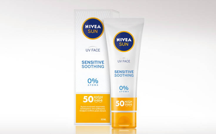 Από τη νέα σειρά αντηλιακής προστασίας NIVEA SUN Sensitive δεν θα μπορούσε να λείπει η προστασία της ευαίσθητης επιδερμίδας του προσώπου. Η νέα αντηλιακή κρέμα προσώπου NIVEA SUN UV Face Sensitive Soothing προσφέρει πολύ υψηλή αντηλιακή προστασία ευρέως φάσματος για την προστασία από τη φωτογήρανση που προκαλεί η UV ακτινοβολία.