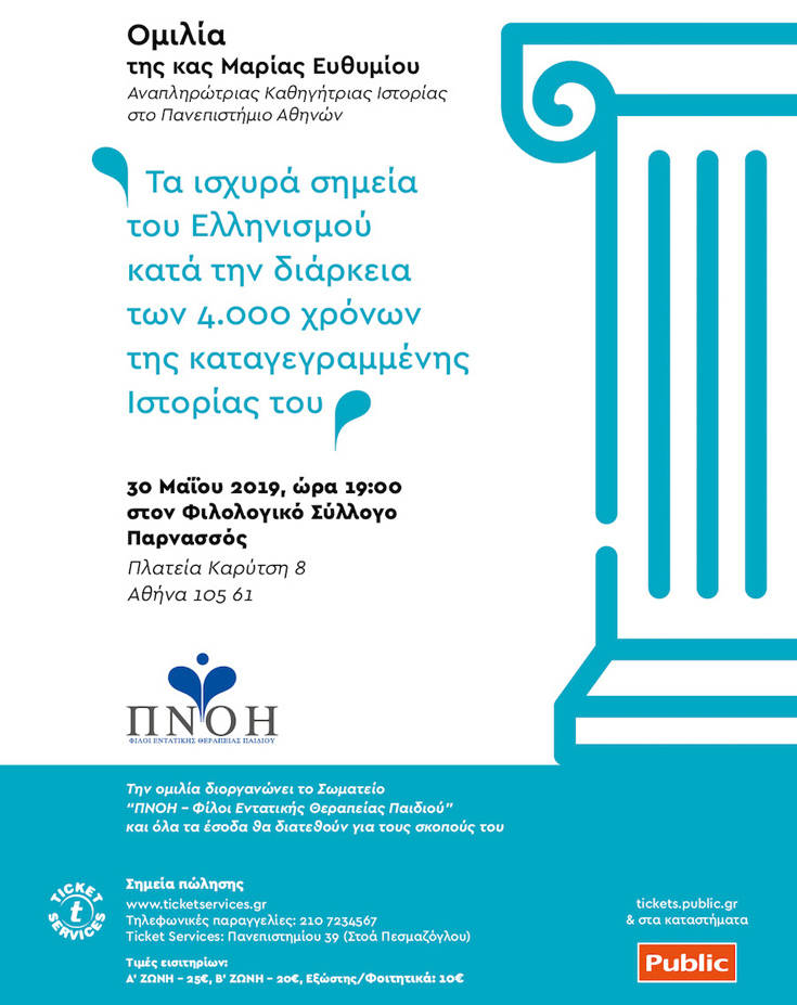 Εκδήλωση με ομιλήτρια την Αναπληρώτρια Καθηγήτρια Ιστορίας στο Πανεπιστήμιο Αθηνών διοργανώνει στις 30 Μαΐου στον Φιλολογικό Σύλλογο «Παρνασσός» το Σωματείο ΠΝΟΗ.