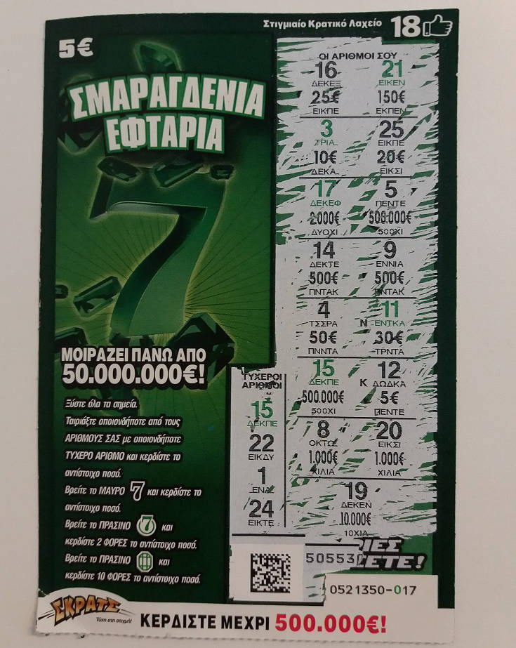 Η σύζυγος του μεγάλου νικητή κατάφερε με τη γνωστή γυναικεία πειθώ το σύζυγό της να δοκιμάσουν την τύχη τους στα ΣΚΡΑΤΣ ενός λαχειοπώλη και διάλεξε, μάλιστα, η ίδια με το χέρι της το τυχερό δελτίο «Σμαραγδένια Εφτάρια» που κέρδισε τα 500.000 ευρώ.