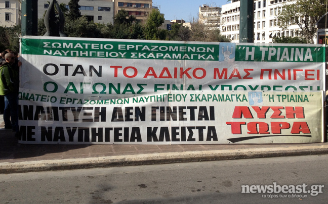 Στη πλατεία Κλαυθμώνος συγκεντρώνονται αυτή την ώρα εργαζόμενοι στα ναυπηγεία Σκαραμαγκά, προκειμένου να ξεκινήσουν πορεία προς τη Βουλή, όπου έχουν προγραμματισμένο ραντεβού με τον υπουργό Εθνικής Άμυνας, Πάνο Παναγιωτόπουλο.