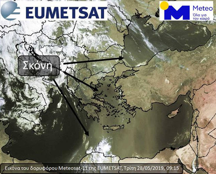 Στο χάρτη που ακολουθεί (εικόνα του μετεωρολογικού δορυφόρου Meteosat-11 της EUMETSAT στις 09:15), φαίνεται ότι η αιωρούμενη στην ατμόσφαιρα σκόνη εκτείνεται έως τη Μαύρη Θάλασσα, ενώ καλύπτει τα νότια και ανατολικά διαμερίσματα της χώρας μας καθώς και το Μεγαλύτερο μέρος της Ανατολικής Μεσογείου.