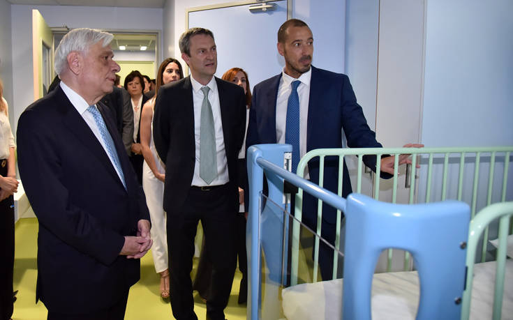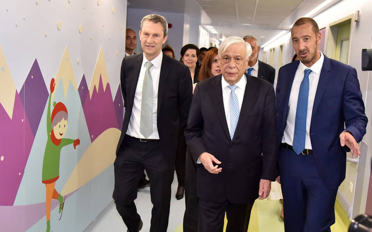 Ξενάγηση του Προέδρου της Δημοκρατίας Προκόπιου Παυλόπουλου στις δύο νοσηλευτικές μονάδες του 4ου ορόφου του Νοσοκομείου Παίδων «Η Αγία Σοφία» από τον Ντάμιαν Κόουπ, Διευθύνοντα Σύμβουλο του ΟΠΑΠ, και τον Εμμανουήλ Παπασάββα, Κοινό Διοικητή των Διασυνδεόμενων Παιδιατρικών Νοσοκομείων