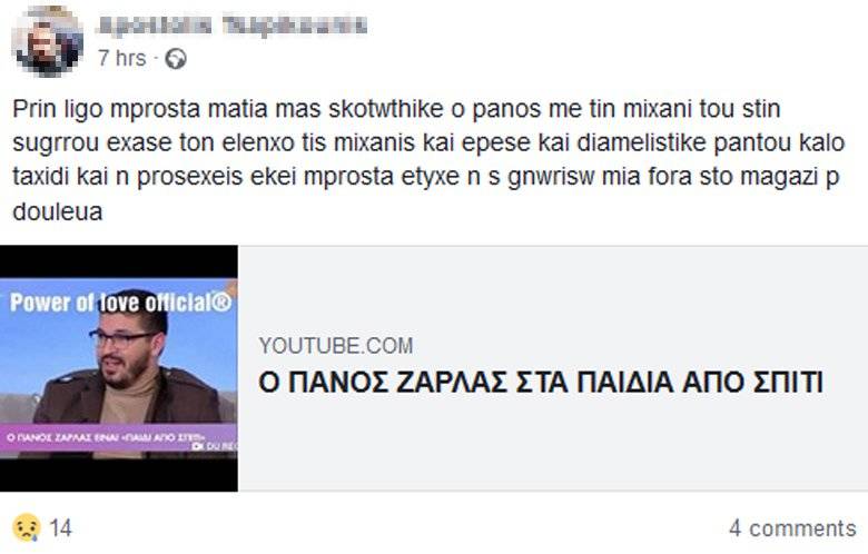«Πριν λίγο μπροστά στα μάτια μας σκοτώθηκε ο Πάνος με την μηχανή του στην Συγγρού,έχασε τον έλεγχο έπεσε και διαμελίστηκε παντού. Καλό ταξίδι και να προσέχεις εκεί μπροστά, έτυχε να σε γνωρίσω μια φορά στο μαγαζί που δούλευα» γράφει ο χρήστης.