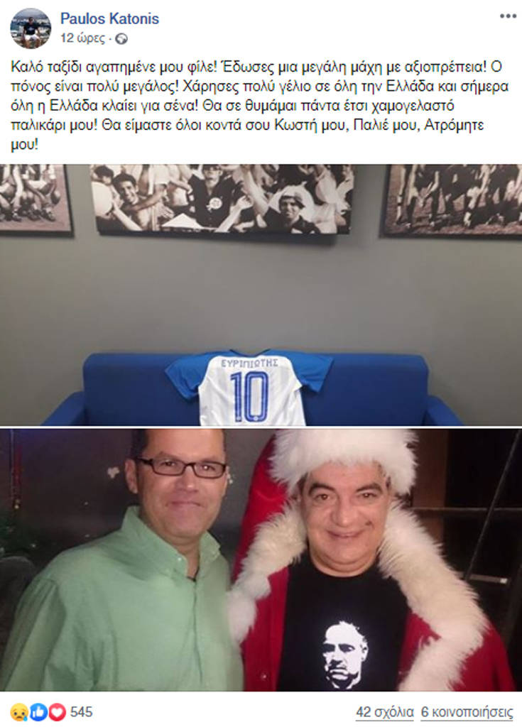 «Καλό ταξίδι αγαπημένε μου φίλε! Έδωσες μια μεγάλη μάχη με αξιοπρέπεια! Ο πόνος είναι πολύ μεγάλος! Χάρισες πολύ γέλιο σε όλη την Ελλάδα και σήμερα όλη η Ελλάδα κλαίει για σένα! Θα σε θυμάμαι πάντα έτσι χαμογελαστό παλικάρι μου! Θα είμαστε όλοι κοντά σου Κωστή μου, Παλιέ μου, Ατρόμητε μου!», ήταν το συγκινητικό μήνυμα που συνόδευσε τη φωτογραφία.