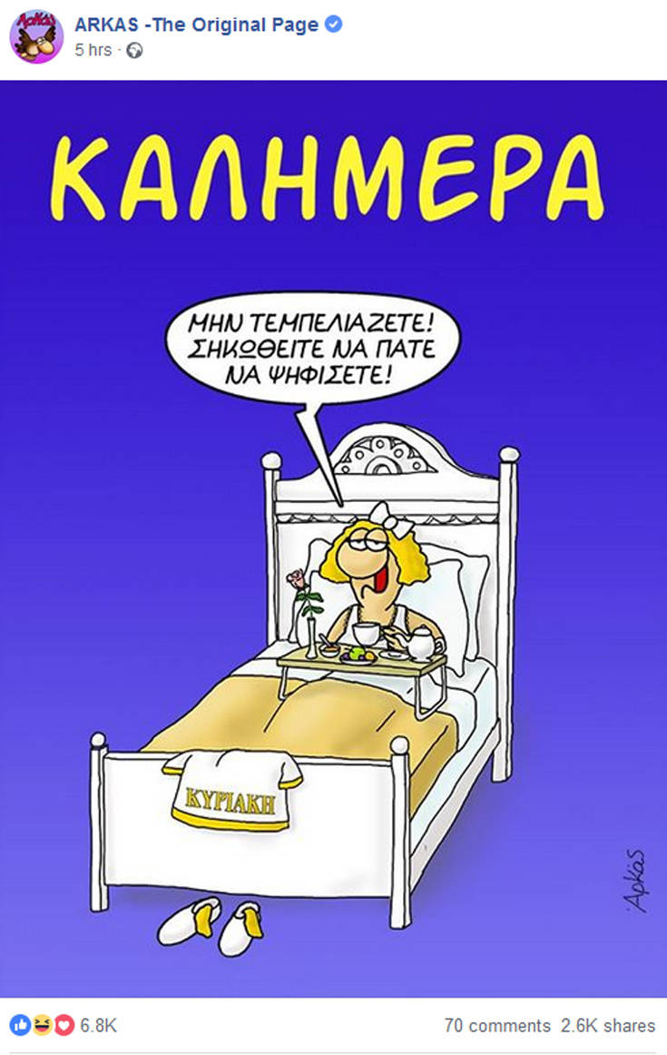 Με ένα νέο σκίτσο ο Αρκάς προτρέπει τους πολίτες να συμμετέχουν στις σημερινές επαναληπτικές εκλογές για την ανάδειξη δημάρχων και περιφερειαρχών.