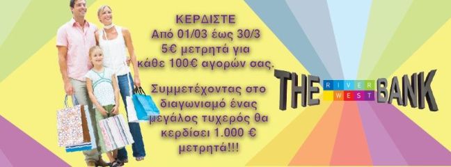 Όλοι οι επισκέπτες του RIVER WEST θα έχουν την ευκαιρία να κάνουν τις αγορές τους από όλα τα καταστήματα του εμπορικού κέντρου και να συλλέξουν ημερήσιες αποδείξεις ώστε για κάθε 100€ να μπορούν να παίρνουν επιστροφή 5€ σε μετρητά.