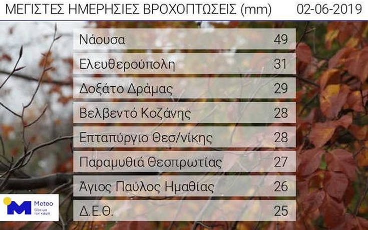 Σχετικά μεγάλα ύψη ολικού υετού καταγράφηκαν σε όλη τη Μακεδονία. Οι σταθμοί του δικτύου αυτόματων μετεωρολογικών σταθμών του Εθνικού Αστεροσκοπείου Αθηνών/meteo.gr κατέγραψαν τα μεγαλύτερα ύψη ολικού υετού στη Νάουσα, στην Ελευθερούπολη, στο Δοξάτο Δράμας, στο Βελβεντό Κοζάνης και στο Επταπύργιο Θεσσαλονίκης.