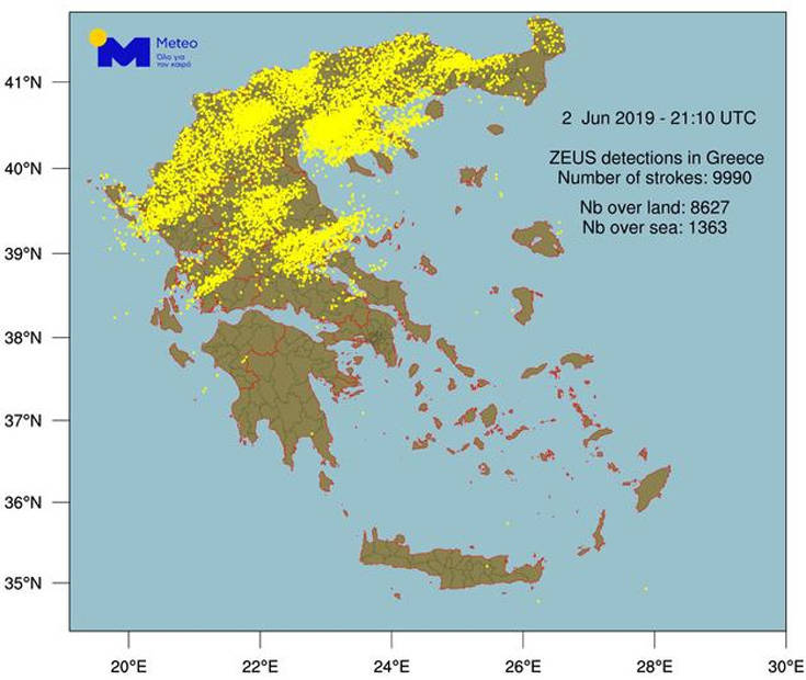 Το σύστημα εντοπισμού κεραυνών «ΖΕΥΣ» του Εθνικού Αστεροσκοπείου Αθηνών κατέγραψε 9.990 κεραυνούς στην κεντρική και βόρεια ηπειρωτική χώρα την Κυριακή, ημέρα των εκλογών.
