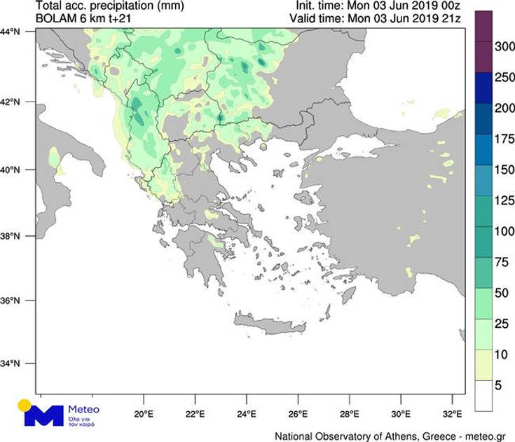 Στο χάρτη που ακολουθεί μπορείτε να δείτε τα εκτιμώμενα αθροιστικά ύψη βροχόπτωσης έως το βράδυ της Δευτέρας: