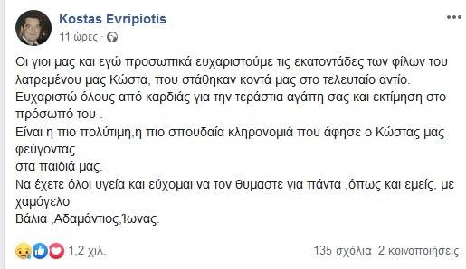 «Οι γιοι μας και εγώ προσωπικά ευχαριστούμε τις εκατοντάδες των φίλων του λατρεμένου μας Κώστα, που στάθηκαν κοντά μας στο τελευταίο αντίο. Ευχαριστώ όλους από καρδιάς για την τεράστια αγάπη σας και εκτίμηση στο πρόσωπό του. Είναι η πιο πολύτιμη, η πιο σπουδαία κληρονομιά που άφησε ο Κώστας μας φεύγοντας στα παιδιά μας. Να έχετε όλοι υγεία και εύχομαι να τον θυμαστε για πάντα, όπως και εμείς, με χαμόγελο Βάλια, Αδαμάντιος, Ίωνας», έγραψε στην προσωπική σελίδα του Κώστα Ευριπιώτη στο Facebook.