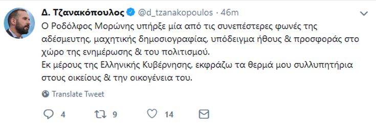 «Ο Ροδόλφος Μορώνης υπήρξε μία από τις συνεπέστερες φωνές της αδέσμευτης, μαχητικής δημοσιογραφίας, υπόδειγμα ήθους & προσφοράς στο χώρο της ενημέρωσης & του πολιτισμού. Εκ μέρους της Ελληνικής Κυβέρνησης, εκφράζω τα θερμά μου συλλυπητήρια στους οικείους & την οικογένεια του», ανέφερε σε μήνυμά του στο twitter ο κυβερνητικός εκπρόσωπος Δημήτρης Τζανακόπουλος.