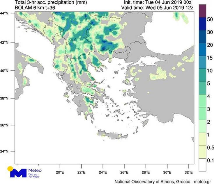 Την Τετάρτη 5/6 η αστάθεια θα είναι εντονότερη και θα επηρεάσει περισσότερες περιοχές της χώρας, ενώ τα φαινόμενα σε ορισμένες περιπτώσεις είναι πολύ πιθανό να συνοδευτούν από χαλαζοπτώσεις. Στο χάρτη που ακολουθεί μπορείτε να δείτε την κατανομή των βροχοπτώσεων τις μεσημεριανές ώρες της Τετάρτης.