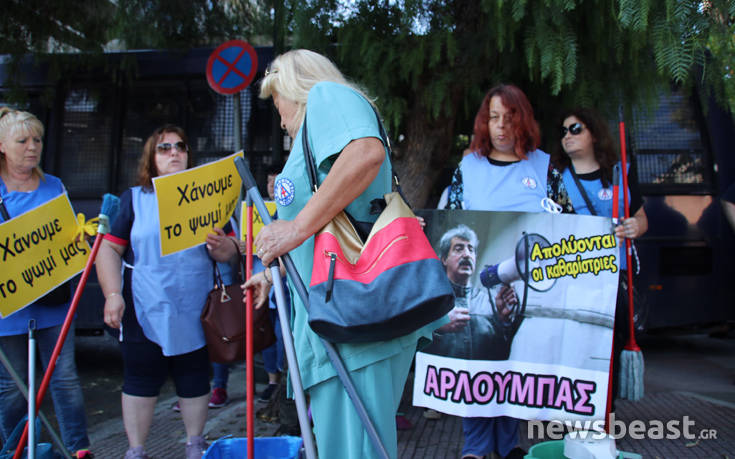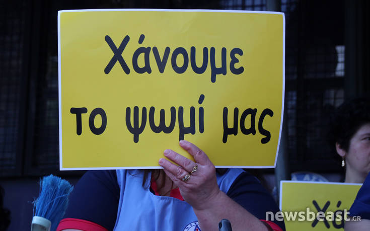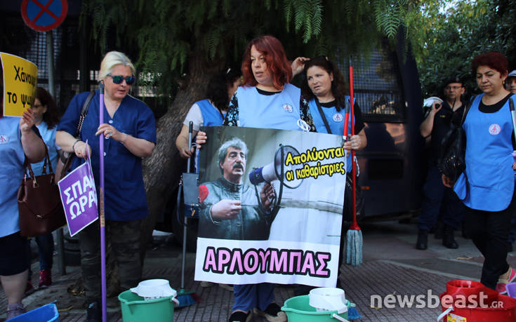 Επίσης, οι καθαρίστριες κρατούν και πλακάτ τα οποία έχουν το σύνθημα «Χάνουμε το ψωμί μας», αλλά και ένα πιο μικρό πανό με τη μορφή του αναπληρωτή υπουργού Υγείας, όπου από κάτω γράφει τη λέξη «Αρλούμπας».