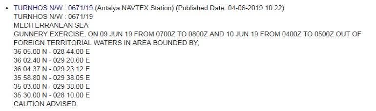Για τις 9 και 10 Ιουνίου η Τουρκία δεσμεύει εκ νέου την ίδια περιοχή που είχε δεσμεύσει για χθες και σήμερα νότια του Καστελόριζου και ανατολικά της Ρόδου για άσκηση με την χρήση όπλων.