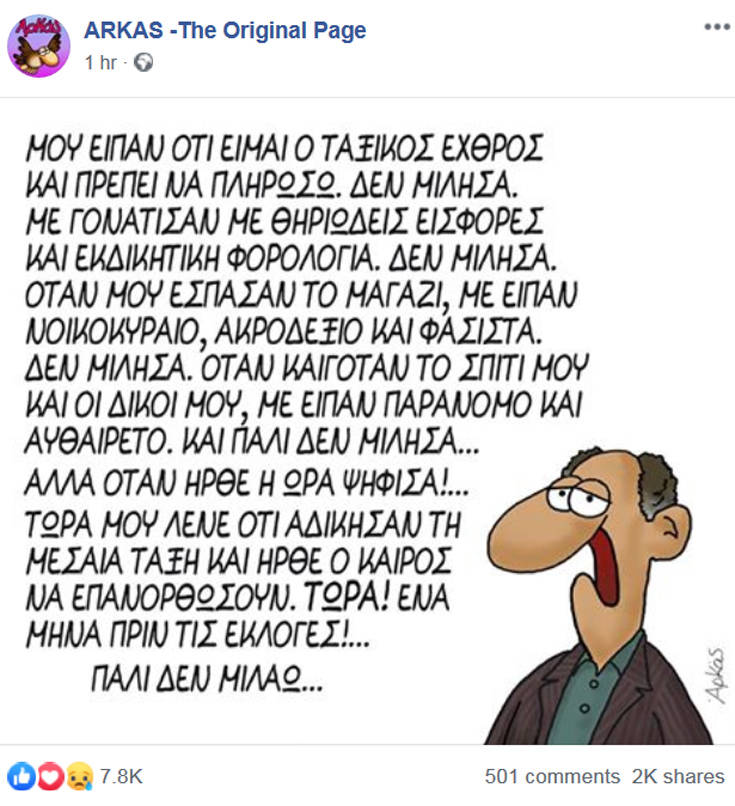 Αλλά όταν ήρθε η ώρα ψήφισα! Τώρα μου λένε ότι αδίκησαν τη μεσαία τάξη και ήρθε ο καιρός να επανορθώσουν. ΤΩΡΑ! Ένα μήνα πριν τις εκλογές. Πάλι δεν μιλάω».