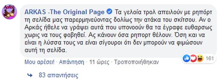 Μάλιστα, οι διαχειριστές της σελίδας απάντησαν, κάνοντας λόγο για τρολ που απειλούν με report τη σελίδα. «Τα γελοία τρολ απειλούν με ρηπόρτ τη σελίδα μας παρερμηνεύοντας δολίως την ατάκα του σκίτσου. Αν ο Αρκάς ήθελε να γράψει αυτά που υπονοούν θα τα έγραφε ευθαρσως χωρις να τους φοβηθεί. Ας κάνουν όσα ρηπορτ θέλουν. Όση και να είναι η λύσσα τους να είναι σίγουροι ότι δεν μπορούν να φιμώσουν αυτή τη σελίδα», ανέφεραν.