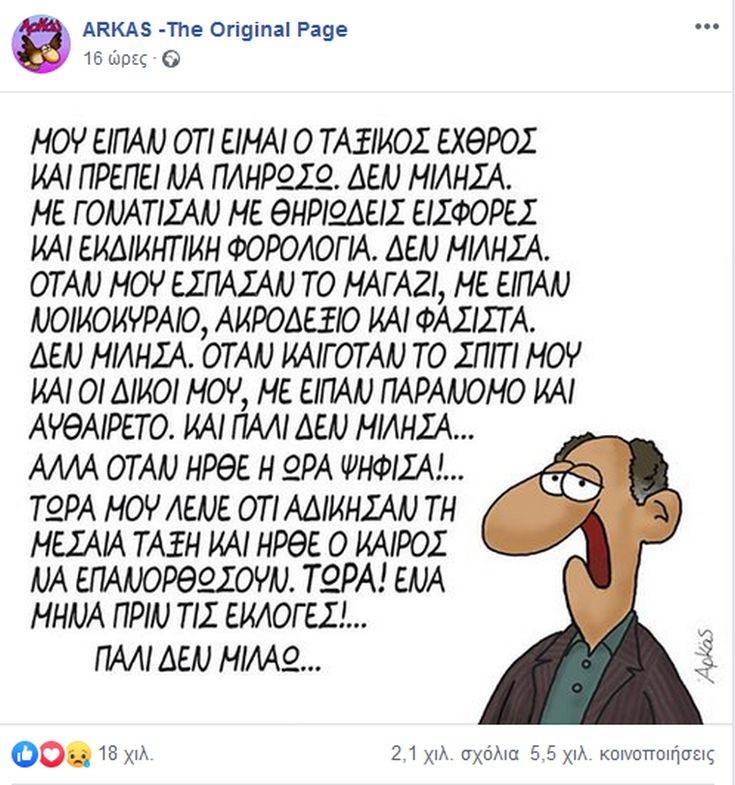 Περισσότερα από 2.000 σχόλια και δεκάδες χιλιάδες αντιδράσεις προκάλεσε το σκίτσο που αναρτήθηκε στην επίσημη σελίδα του Αρκά στο Facebook για τη μεσαία τάξη, τους νοικοκυραίους και τους φασίστες.
