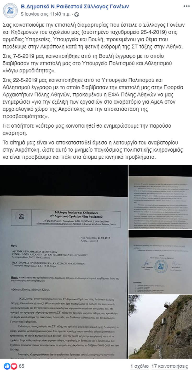 «Η επιστολή του συλλόγου Γονέων και Κηδεμόνων του 2ου Δημοτικού Σχολείου Νέας Ραιδεστού και το ατυχές συμβάν κατά την επίσκεψη του εν λόγω σχολείου στο χώρο της Ακρόπολης, έφεραν στη δημοσιότητα το ζήτημα του αναβατορίου για τους ανάπηρους επισκέπτες του μνημείου.