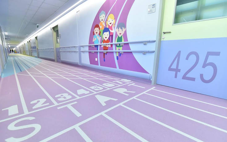 Πολύχρωμες ζωγραφιές που απεικονίζουν χαμογελαστά παιδικά πρόσωπα και μοτίβα από αθλητικές δραστηριότητες κοσμούν πλέον τους τοίχους του τέταρτου ορόφου του παιδιατρικού νοσοκομείου «Η Αγία Σοφία», που παραδόθηκε πλήρως ανακαινισμένος από το ΟΠΑΠ, την Πέμπτη 30 Μαΐου 2019.