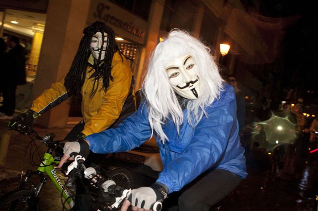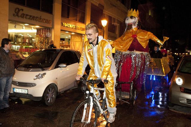 Ποδηλάτες και πεζοί καρναβαλιστές συγκεντρώθηκαν και φέτος, παρά τη βροχή, στην πλατεία Χρηματιστηρίου για να διεκδικήσουν το δικό τους χώρο σε μια πόλη, όπου κυριαρχεί το αυτοκίνητο.