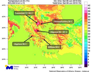 Όπως φαίνεται στο χάρτη που ακολουθεί, το Σάββατο 08/06 οι υψηλότερες θερμοκρασίες στα ηπειρωτικά θα σημειωθούν στην πεδιάδα της Θεσσαλίας όπου οι μέγιστες θα φτάσουν στους 35-37 βαθμούς και στην πεδιάδα των Γιαννιτσών όπου θα φτάσουν στους 37-38 βαθμούς Κελσίου, σύμφωνα με το meteo.gr.