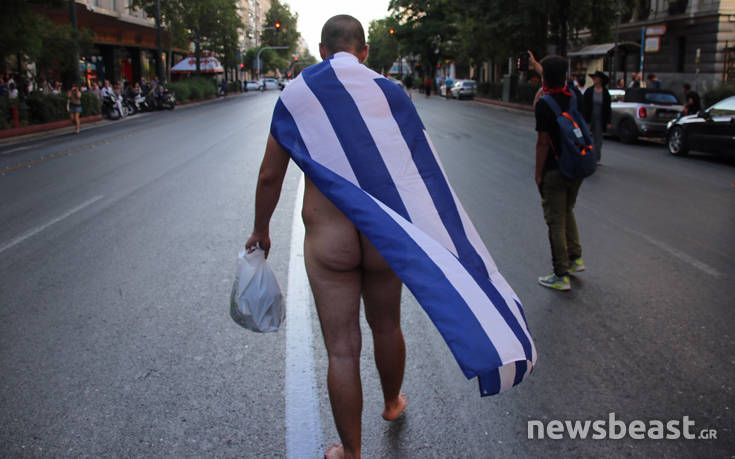 Τα βλέμματα ωστόσο έχει «μαγνητίσει» η εικόνα ενός άνδρα που «παρελαύνει» με αδαμιαία περιβολή, φορώντας μόνο μία ελληνική σημαία, στους δρόμους της πρωτεύουσας.
