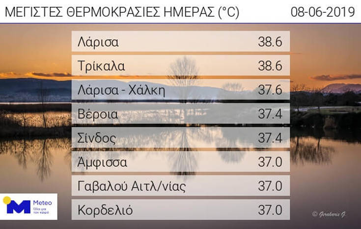 Ο υδράργυρος «χτύπησε κόκκινο» κυρίως σε περιοχές της Θεσσαλίας, καθώς σε Λάρισα και Τρίκαλα η θερμοκρασία έφτασε μέχρι τους 38,6 βαθμούς Κελσίου.