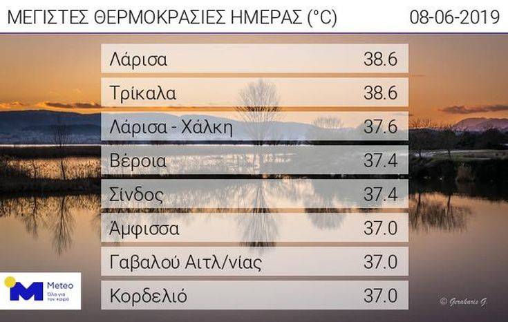 Σύμφωνα με το meteo του Αστεροσκοπείου Αθηνών, χθες Σάββατο η θερμοκρασία ξεπέρασε τους 37 βαθμούς σε αρκετές ηπειρωτικές περιοχές της χώρας τις μεσημεριανές ώρες, με τις υψηλότερες μέγιστες να σημειώνονται στην πεδιάδα της Θεσσαλίας όπου ο υδράργυρος έφτασε στους 38,6 βαθμούς Κελσίου.
