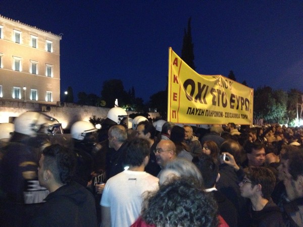 Σε εξέλιξη βρίσκεται στην Πλατεία Συντάγματος η συγκέντρωση των Αγανακτισμένων. Από τις 6:30 έχει κλείσει η λεωφόρος Αμαλίας. Η προσέλευση δεν είναι μεγάλη, καθώς στην πλατεία έχουν συγκεντρωθεί περίπου 500 άτομα. Πριν από λίγη ώρα έκαναν την εμφάνισή τους διμοιρίες των ΜΑΤ που έχουν παραταχθεί ανάμεσα στον κόσμο και στα κάγκελα που βρίσκονται μπροστά από τη Βουλή. Η παρουσία τους έχει προκαλέσει δυσαρέσκεια στους συγκεντρωμένους, ενώ έχουν ακουστεί και αρκετά υβριστικά συνθήματα, κατά της Αστυνομίας.