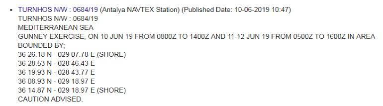 Η Τουρκία στο ίδιο προκλητικό πλαίσιο δέσμευσε για χθες, σήμερα και αύριο περιοχή δυτικά του Καστελόριζου, μέρος της οποίας εμπίπτει σε περιοχή ελληνικής δικαιοδοσίας.