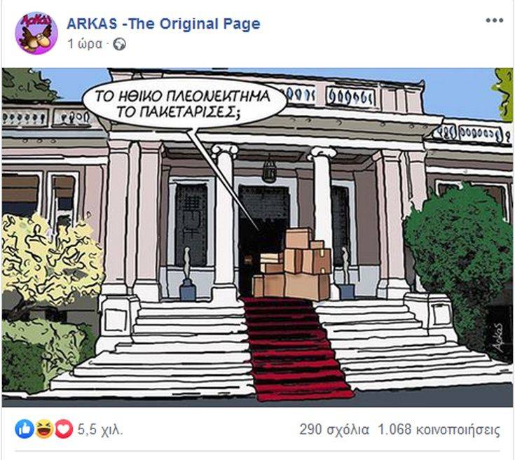Το σκίτσο του Αρκά δείχνει το Μέγαρο Μαξίμου σε διαδικασία μετακόμισης με τις κούτες έξω από την πόρτα του.