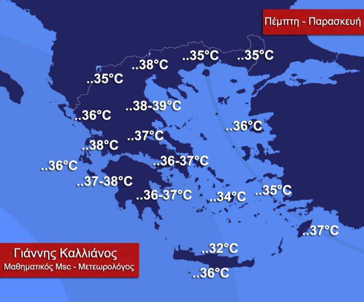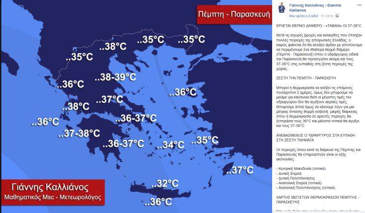 Ο ίδιος κάνει λόγο για ένα ιδιαίτερα θερμό διήμερο (Πέμπτη – Παρασκευή) όπου ο υδράργυρος ειδικά την Παρασκευή θα προσεγγίσει ακόμη και τους 37-38°C στις ευπαθείς στη ζέστη περιοχές της χώρας.