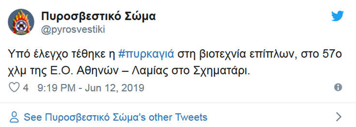 Συναγερμός σήμανε το μεσημέρι της Τετάρτης στην Πυροσβεστική Υπηρεσία από πυρκαγιά που εκδηλώθηκε στους φούρνους βιοτεχνίας επίπλων, στο 57ο χλμ της Εθνικής Οδού Αθηνών – Λαμίας στο Σχηματάρι.