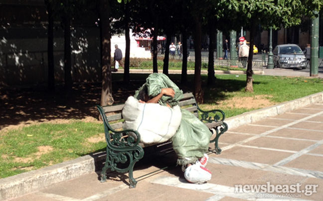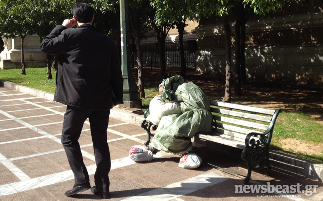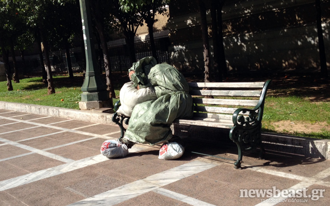 Ο άνθρωπος στη φωτογραφία είναι ακόμη ένας άστεγος που έκανε κρεβάτι ένα παγκάκι στην πλατεία Κολοκοτρώνη στο πλάι της παλιάς Βουλής. «Ντυμένος» με σακούλες σούπερ μάρκετ και λινά πανιά δείχνει το σκληρό πρόσωπο μίας αφιλόξενης πρωτεύουσας.