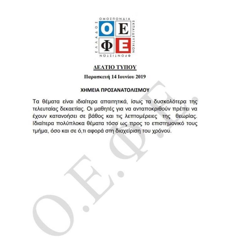 «Τα θέματα ήταν ιδιαίτερα απαιτητικά, ίσως τα δυσκολότερα της τελευταίας δεκαετίας. Οι μαθητές για να ανταποκριθούν πρέπει να έχουν κατανοήσει σε βάθος και τις λεπτομέριες της θεωρίας. Ιδιαίτερα πολύπλοκα θέματα τόσο ως προς το επιστημονικό τους τμήμα, όσο και σε ό,τι αφορά στη διαχείριση του χρόνου» ανέφερε η ΟΕΦΕ για το μάθημα της Χημείας.