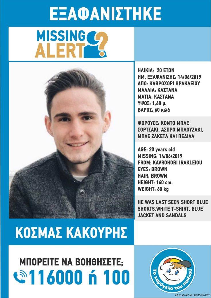 Οι έρευνες βρίσκονται σε εξέλιξη και το Χαμόγελο του Παιδιού εξέδωσε missing alert για τον νεαρό: «Στις 14/6/2019, στις 21:00 ώρα, εξαφανίστηκε από την περιοχή του Καβροχωρίου Ηρακλείου Κρήτης, ο Κοσμάς Κακούρης 20 ετών. Ο Κοσμάς Κακούρης έχει ύψος 1,60μ., ζυγίζει 60 κιλά, έχει καστανά μαλλιά και καστανά μάτια. Για την εξαφάνιση του Κοσμά Κακούρη ενημερωθήκαμε σήμερα απογευματινές ώρες και κατόπιν Εισαγγελικής Εντολής προβήκαμε στη δημοσιοποίηση των στοιχείων του Κοσμά Κακούρη καθώς ενδέχεται συντρέχουν λόγοι οι οποίοι να θέτουν την ζωή του σε κίνδυνο.