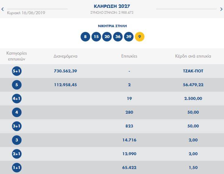 Οι τυχεροί αριθμοί είναι: 8, 15, 20, 36, 39. ΤΖΟΚΕΡ είναι ο αριθμός: 9