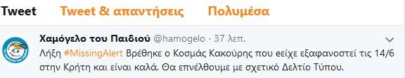 «Βρέθηκε ο Κοσμάς Κακούρης και είναι καλά» αναφέρει στο Twitter το Χαμόγελο του Παιδιού.