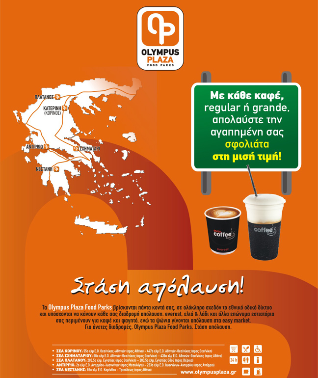 Τα Olympus Plaza Food Parks σας παρέχουν μεταξύ άλλων: δωρεάν Wi-Fi, τουριστικές πληροφορίες, ATM καθώς και χώρους ατομικής υγιεινής και καθαριότητας. Οι πιο σύγχρονοι και ολοκληρωμένοι πολυχώροι του οδικού δικτύου, αποτελούν σημεία συνάντησης και θα τους βρείτε: στην Κατερίνη (Κορινό Πιερίας), στο Σχηματάρι, στο Αντίρριο, στην Τρίπολη (Νεστάνη) και τώρα και στον Πλάτανο Ημαθίας (Εγνατία Οδός).
