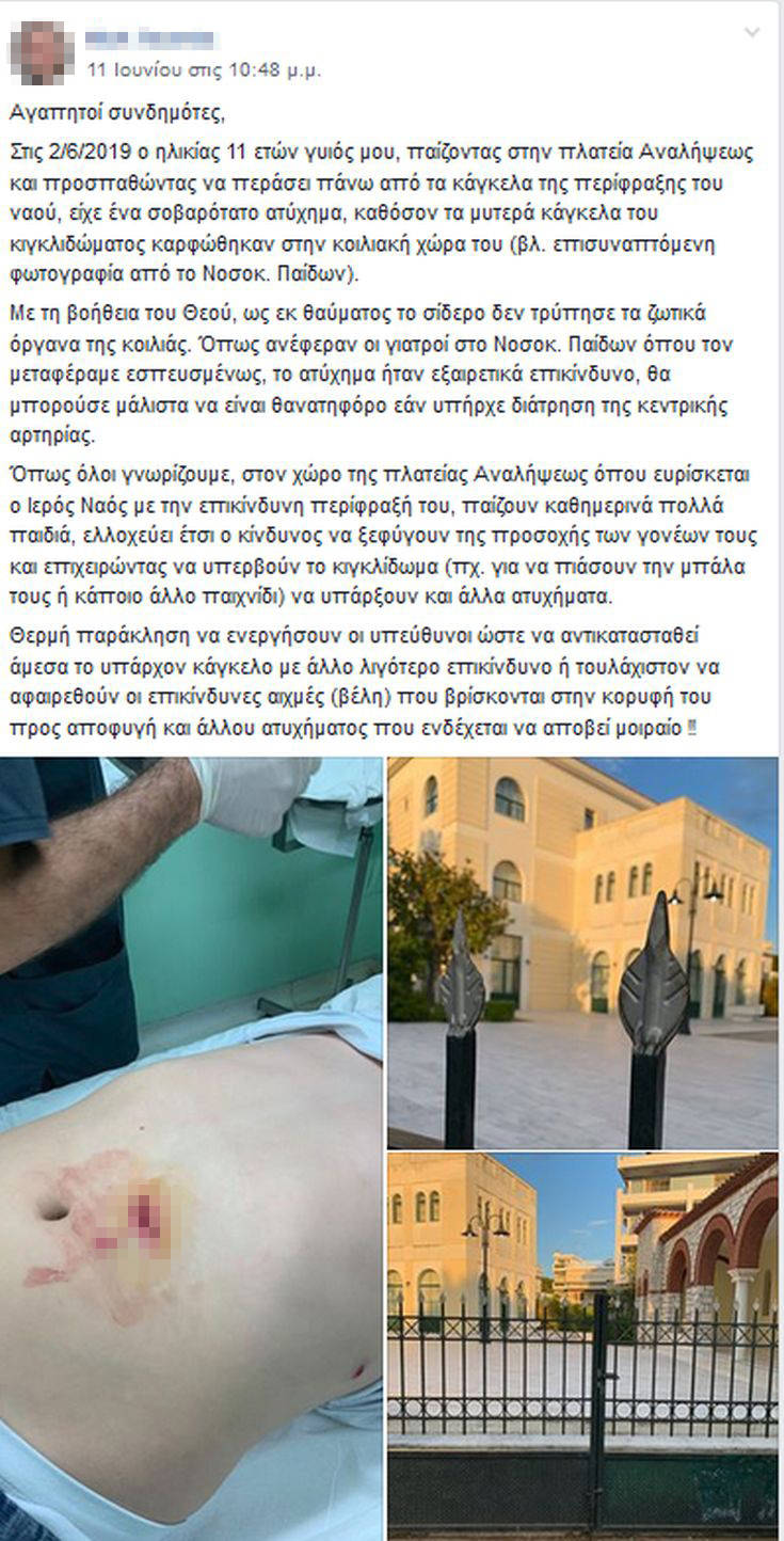 Ένα σοβαρό ατύχημα είχε ένα αγόρι 11 ετών που προσπάθησε να περάσει πάνω από τα κάγκελα της περίφραξης του Ναού της Αναλήψεως στα Βριλήσσια, όπως καταγγέλλει ο πατέρας του σε σελίδα στο Facebook.