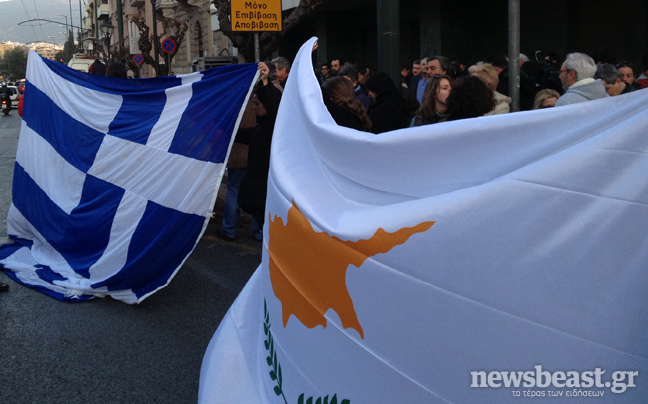 Οι διαδηλωτές κρατούν ελληνικές και κυπριακές σημαίες.