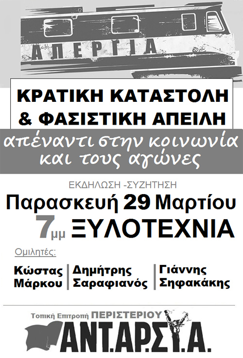 Εκδήλωση θα πραγματοποιήσει η ΑΝΤΑΡΣΥΑ στο Περιστέρι με θέμα: «Κρατική καταστολή και φασιστική απειλή απέναντι στη κοινωνία και τους αγώνες τη», την Παρασκευή 29 Μαρτίου και ώρα 19.00 στην Ξυλοτεχνία.